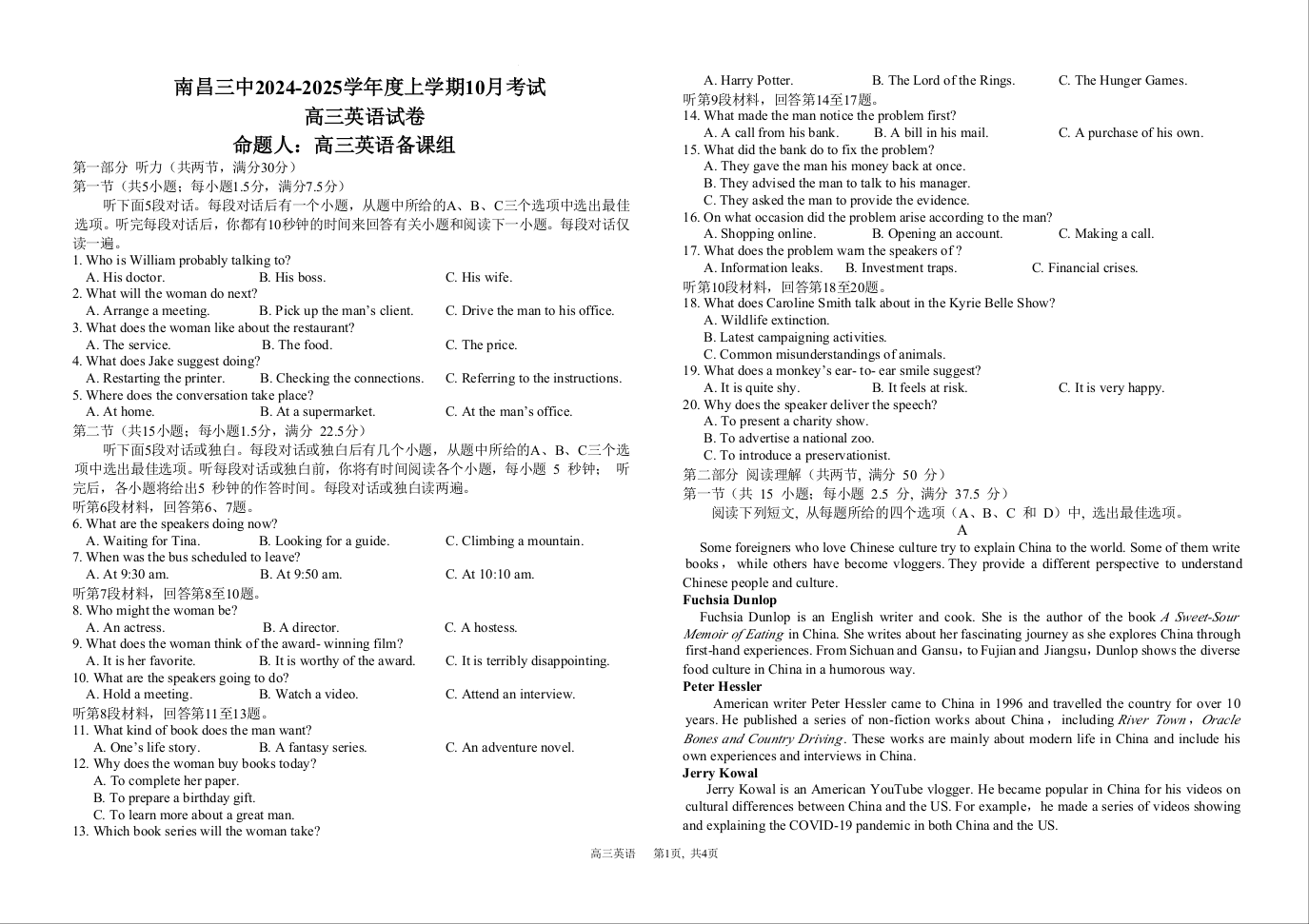江西省南昌市第三中学2025届高三上学期10月月考英语试卷