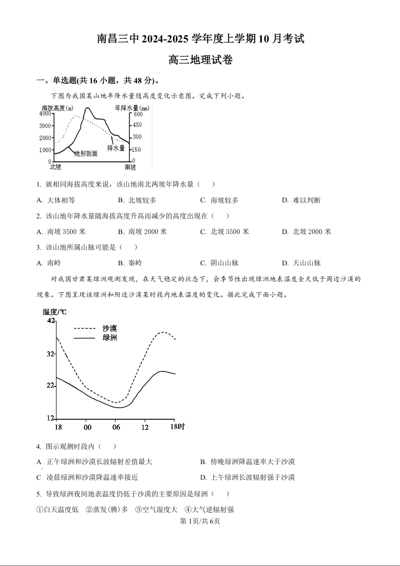 江西省南昌市第三中学2025届高三上学期10月月考地理试题(原卷版)
