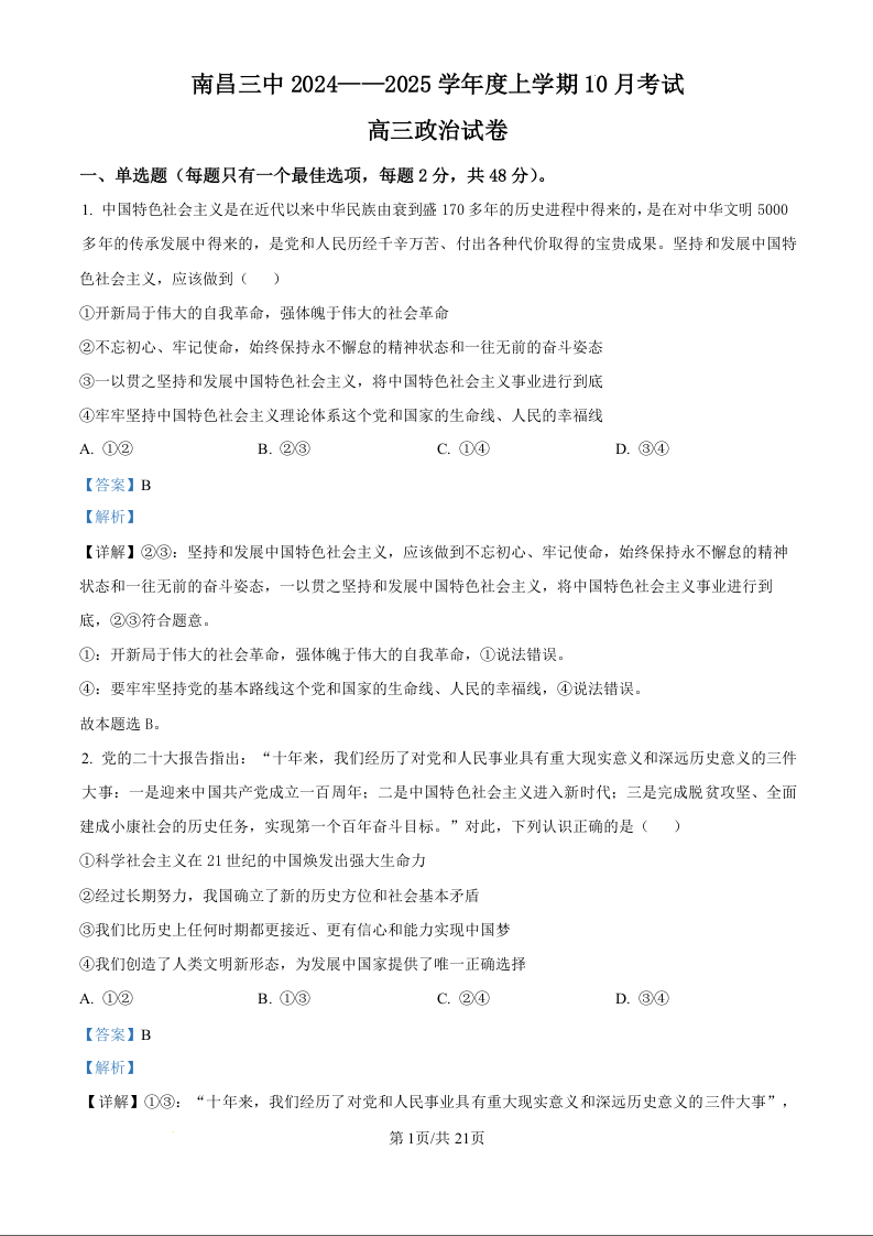 江西省南昌市第三中学2025届高三上学期10月月考政治试题(解析版)