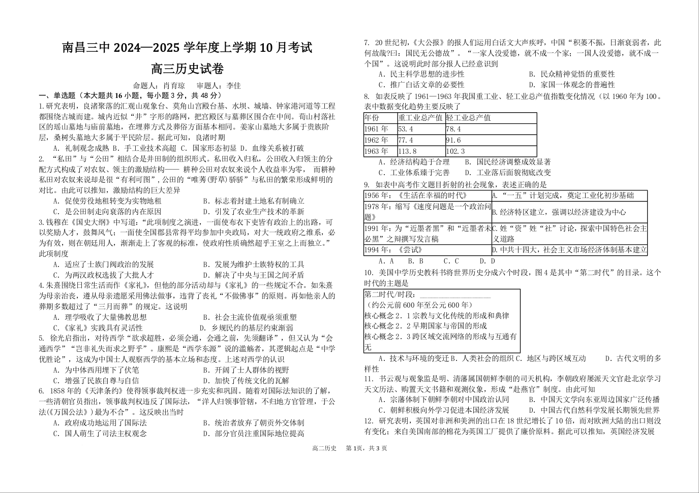 江西省南昌市第三中学2025届高三上学期10月月考历史+答案