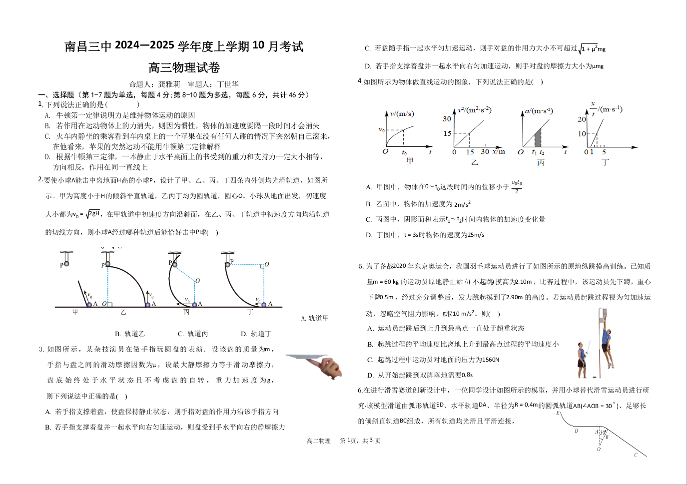 江西省南昌市第三中学2025届高三上学期10月月考物理+答案