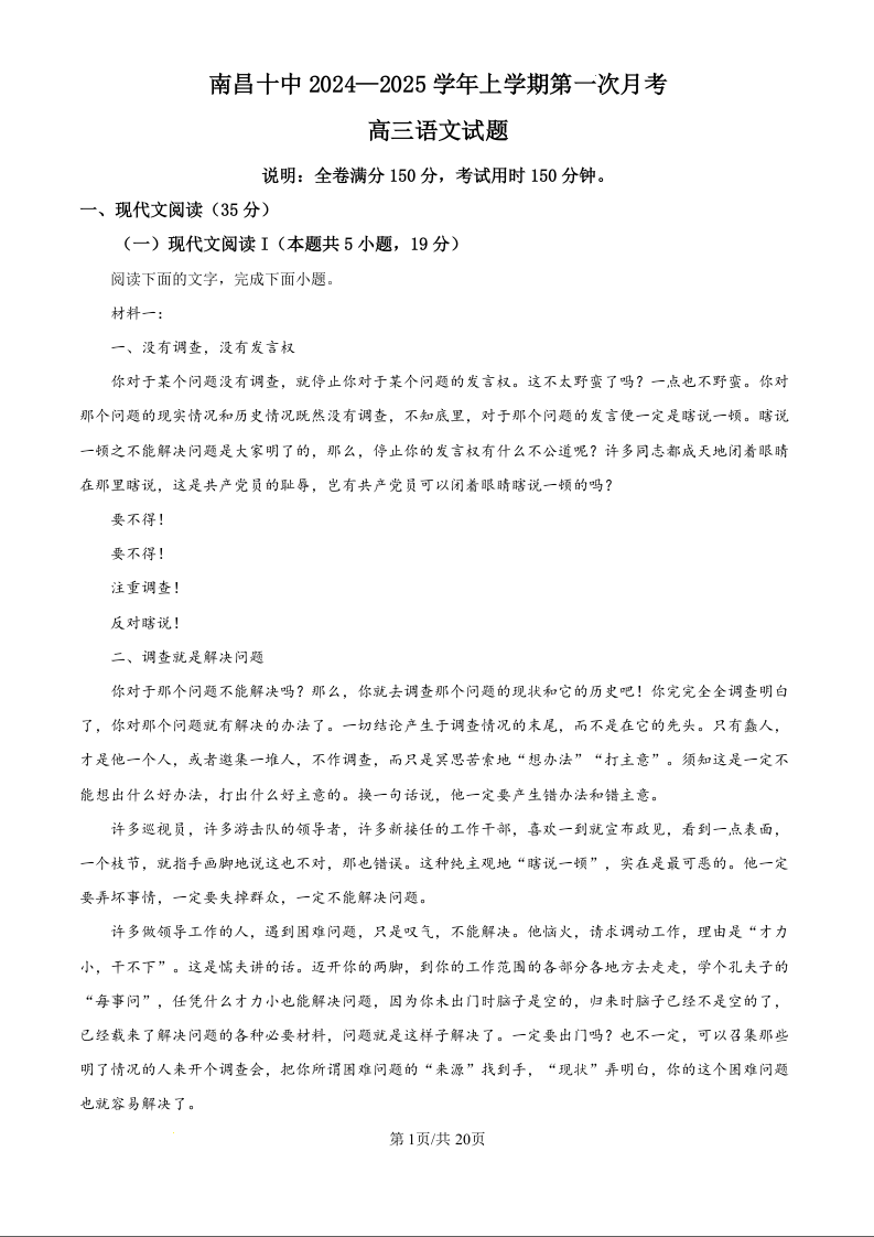 江西省南昌市第十中学2025届高三上学期第一次月考语文答案