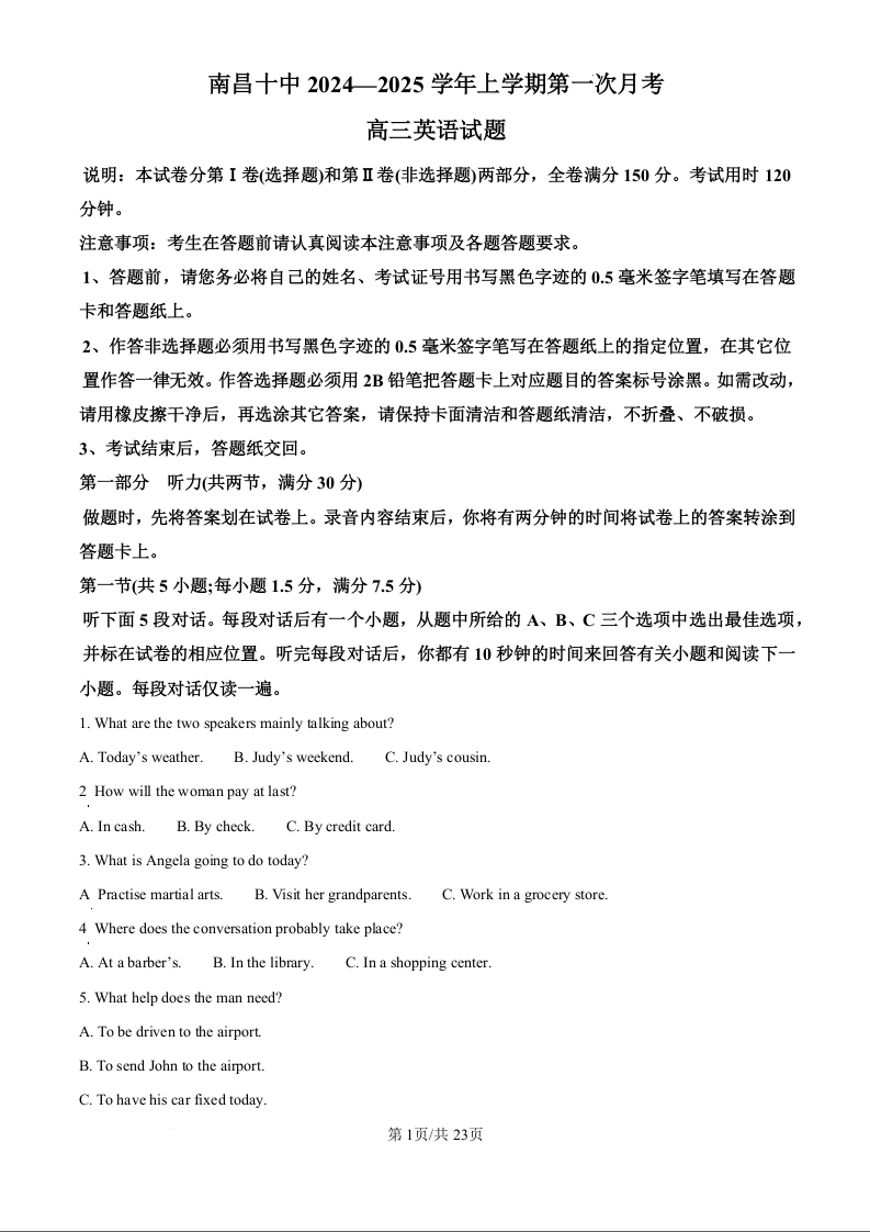 江西省南昌市第十中学2025届高三上学期第一次月考英语答案