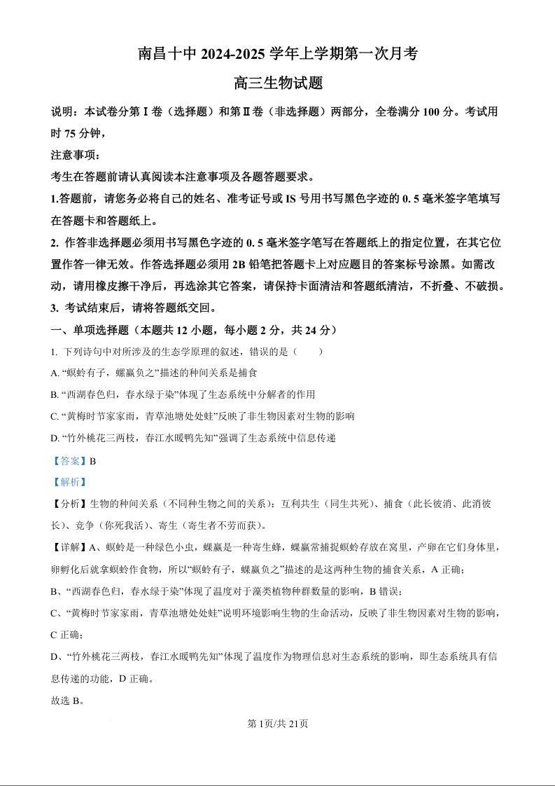 江西省南昌市第十中学2025届高三上学期第一次月考生物答案