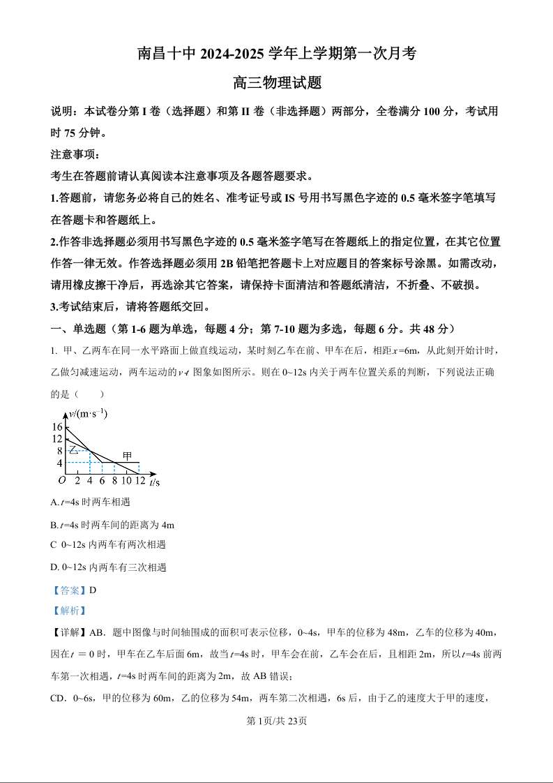 江西省南昌市第十中学2025届高三上学期第一次月考物理答案