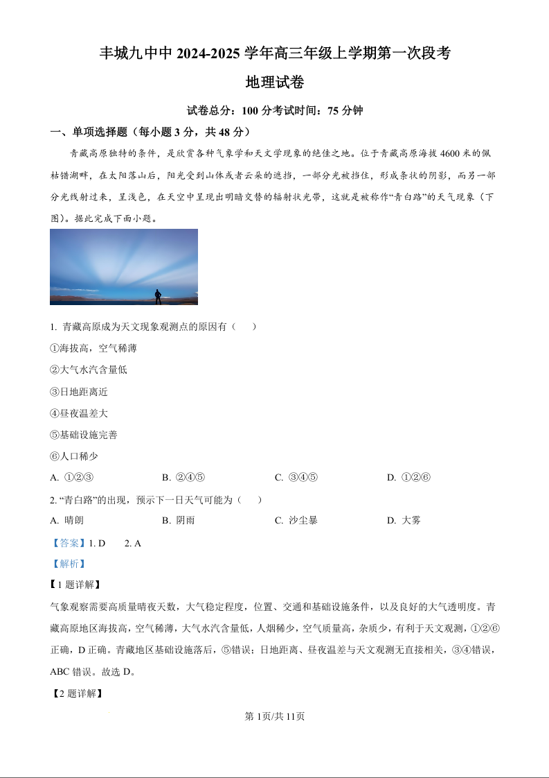 江西省宜春市丰城市第九中学2024-2025学年高三上学期第一次段考地理答案