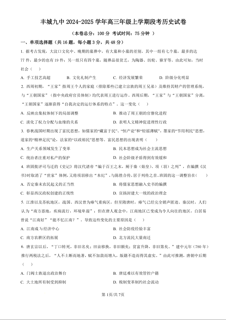 江西省宜春市丰城市第九中学2024-2025学年高三上学期第一次段考历史