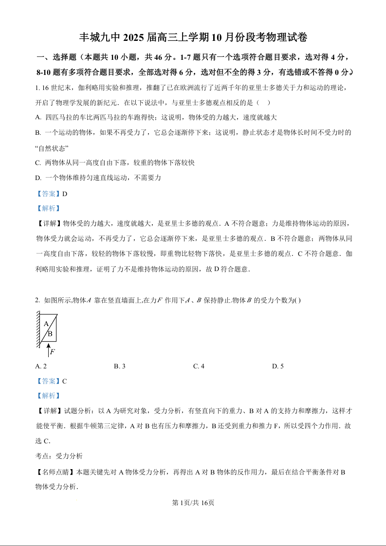 江西省宜春市丰城市第九中学2024-2025学年高三上学期第一次段考(解析版)