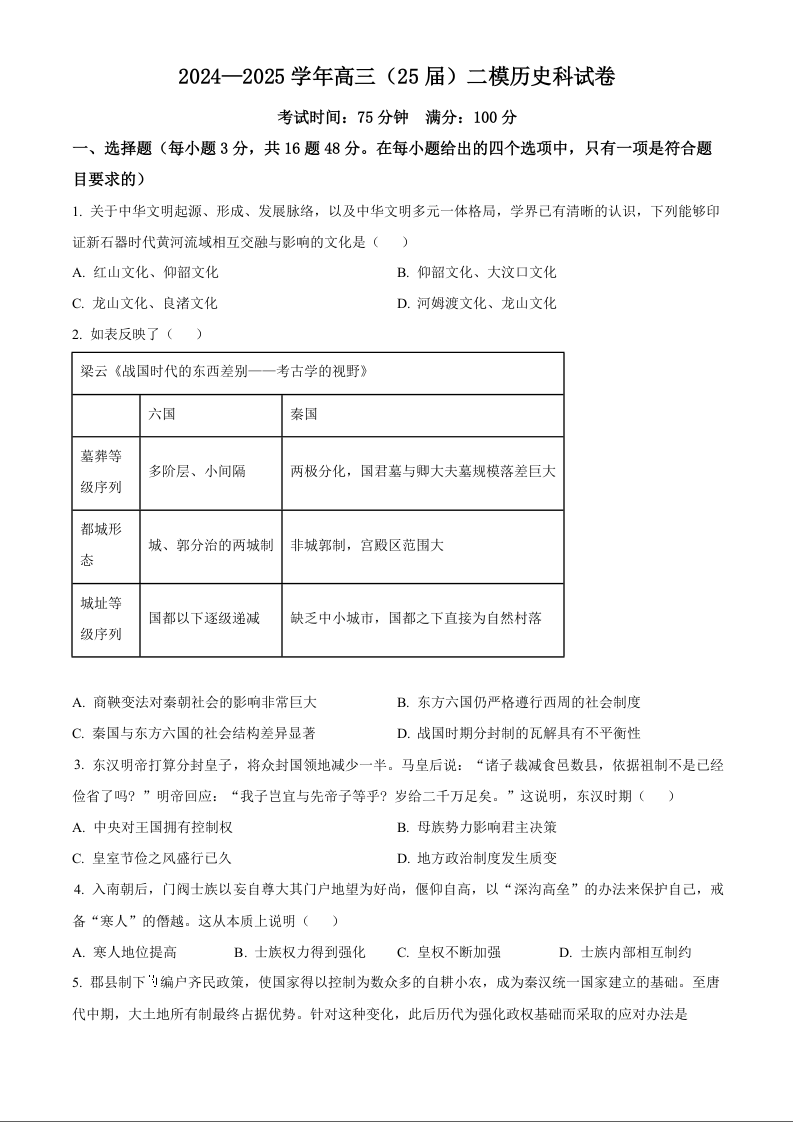辽宁省鞍山市第一中学2025届高三上学期10月二模历史+答案