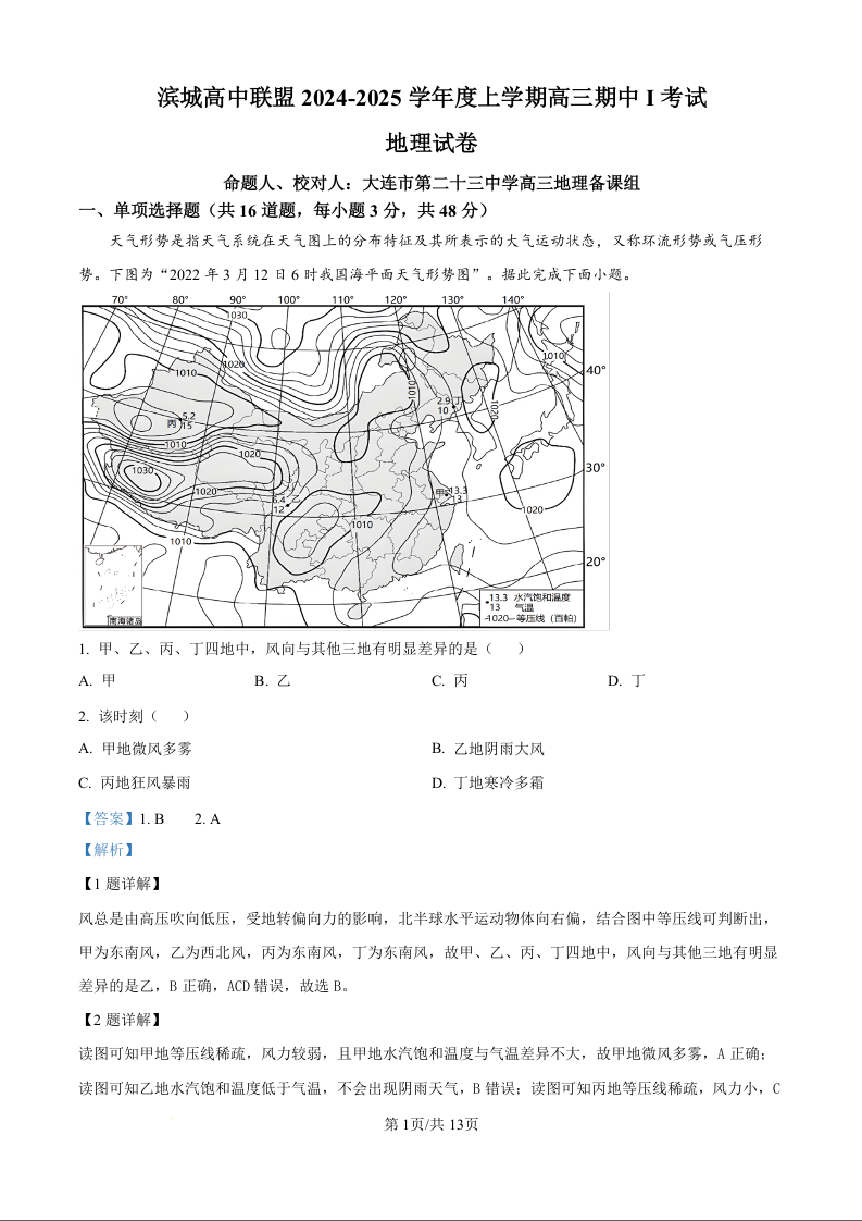 辽宁省大连市滨城高中联盟2025届高三上学期期中考试地理试题(解析版)