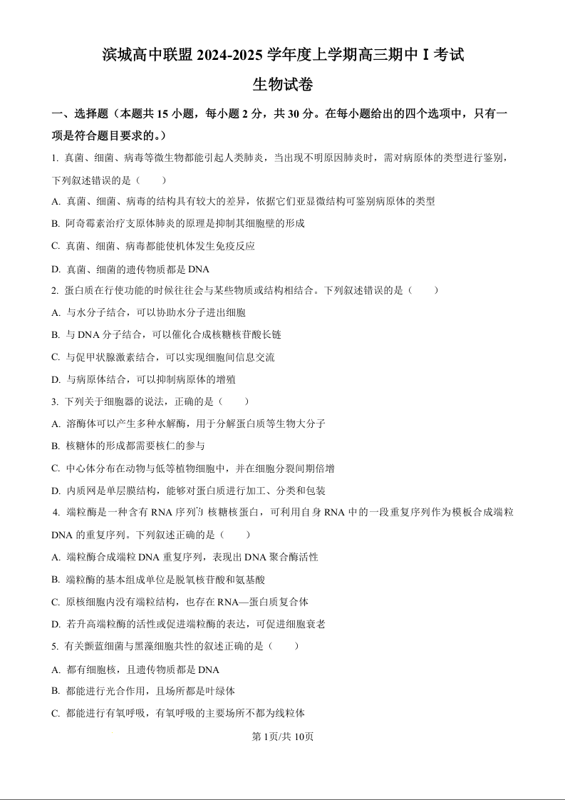 辽宁省大连市滨城高中联盟2025届高三上学期期中考试生物试卷(原卷版)