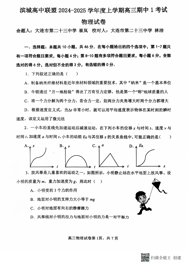 辽宁省大连市滨城高中联盟2025届高三上学期期中考试物理+答案