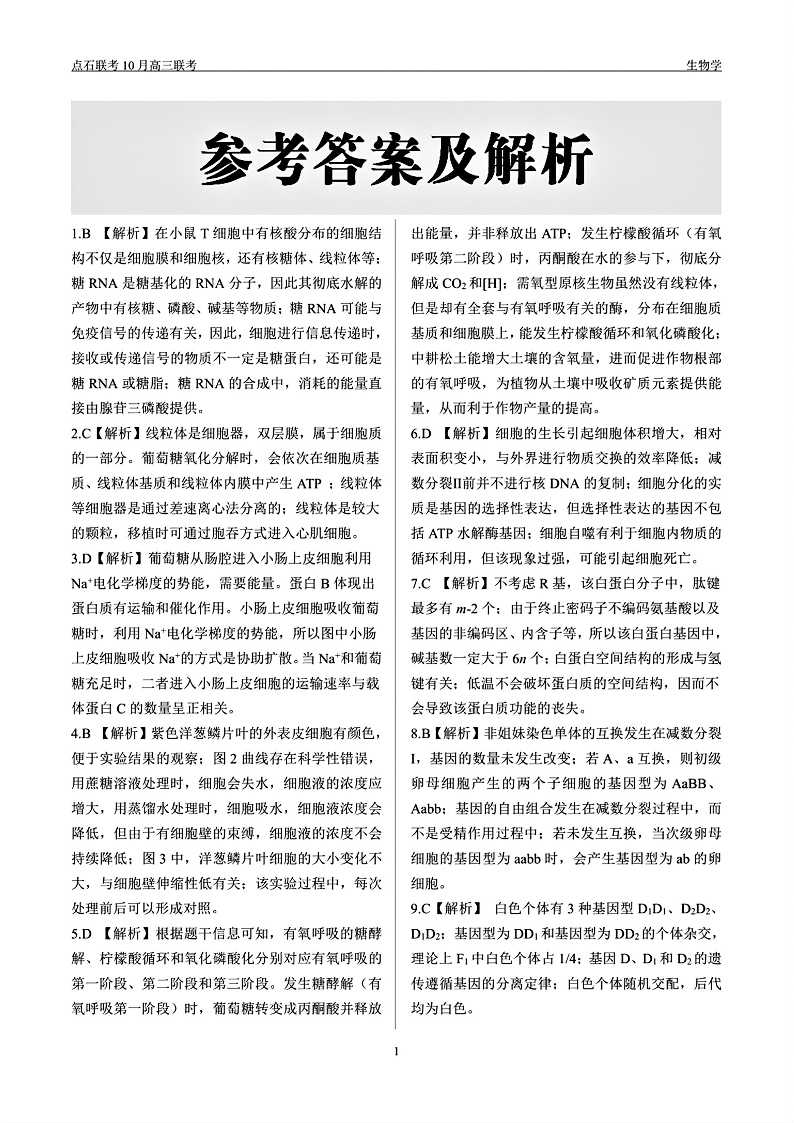 辽宁省点石联考2024-2025学年度高三上学期年级10月阶段考试生物试题答案
