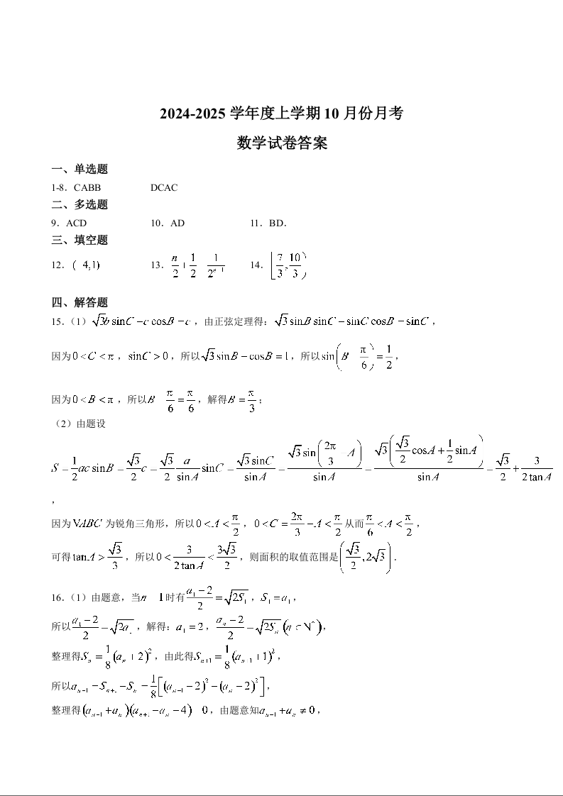 辽宁省沈阳市2025届重点学校高三上学期10月月考数学答案