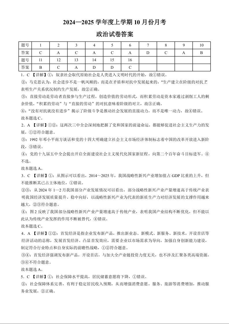 辽宁省沈阳市2025届重点学校高三上学期10月月考政治答案