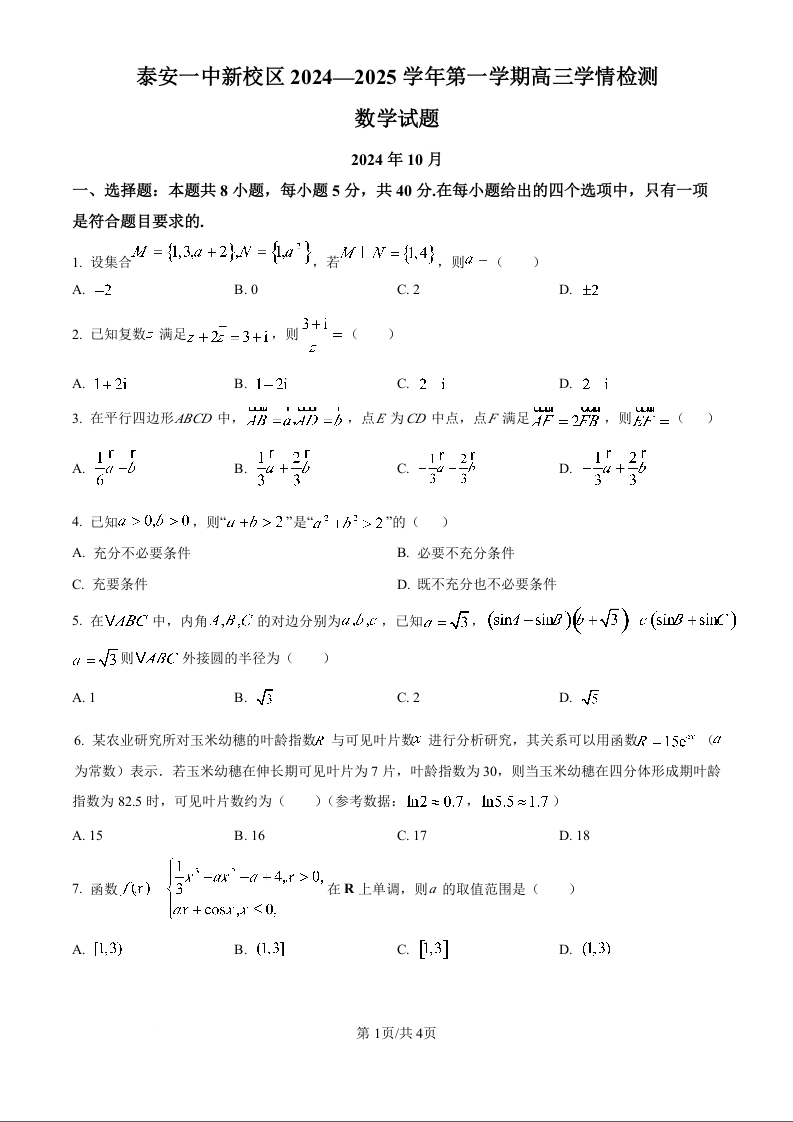 山东省泰安第一中学新校区2024-2025学年高三教学质量检测数学试题(原卷版)