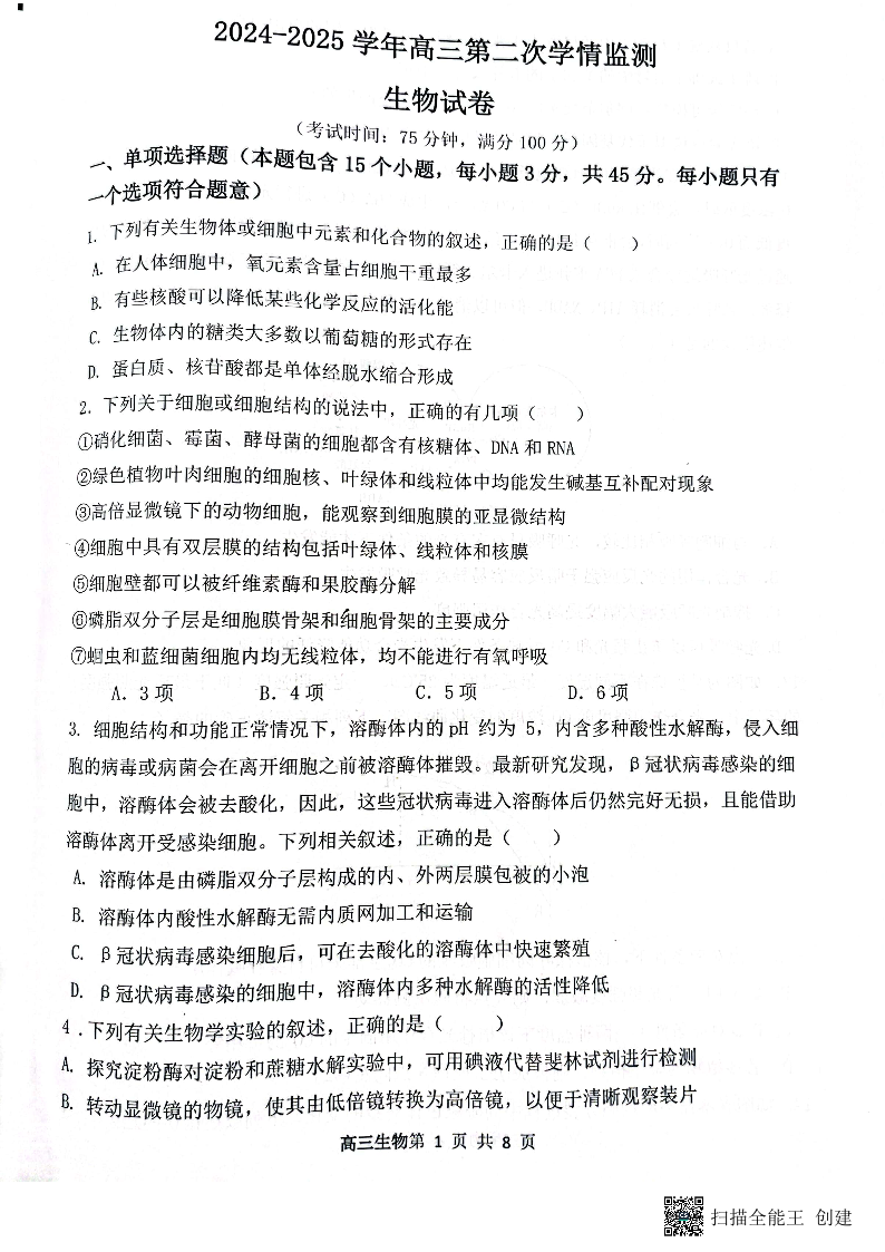 山西省大同市第一中学校2025届高三上学期9月月考生物