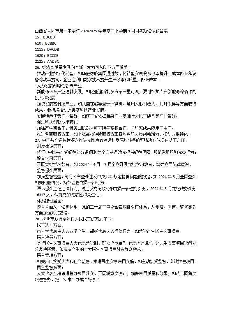 山西省大同市第一中学校2025届高三上学期9月月考政治试题答案