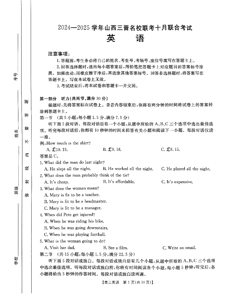 山西省2024-2025学年三晋名校联考10月联合考试英语