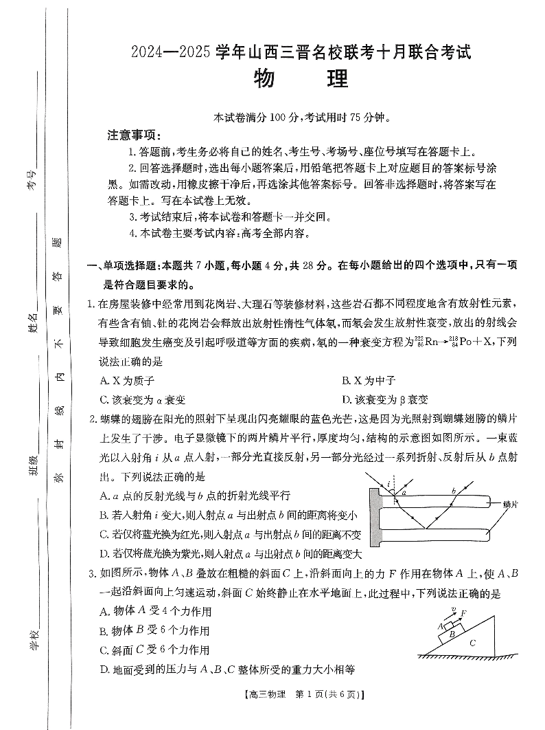 山西省2024-2025学年三晋名校联考10月联合考试物理+答案