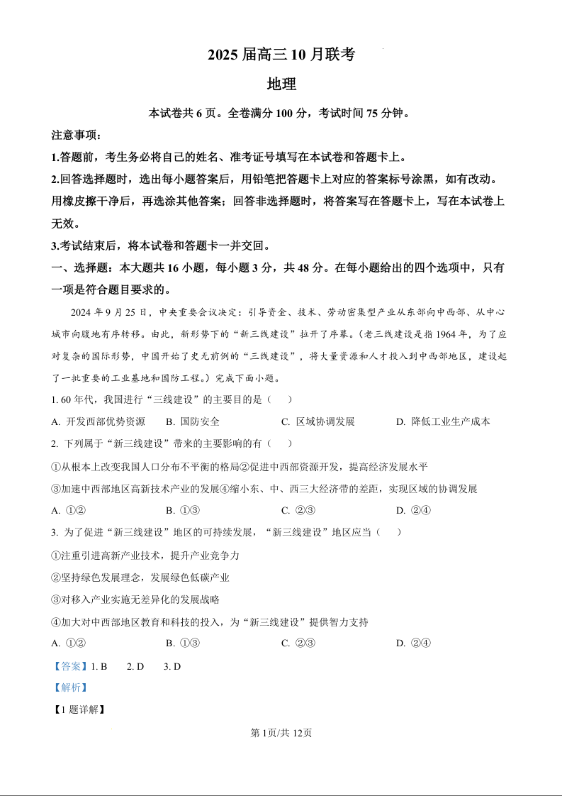 山西省长治市2025届高三上学期10月联考地理试题(解析版)
