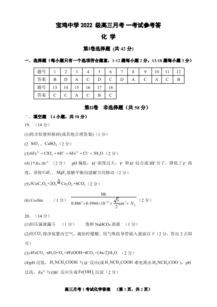 陕西省宝鸡中学2022级高三第一学期月考(一)化学答案