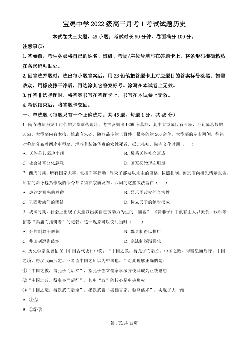 陕西省宝鸡中学2022级高三第一学期月考(一)历史试题(原卷版)