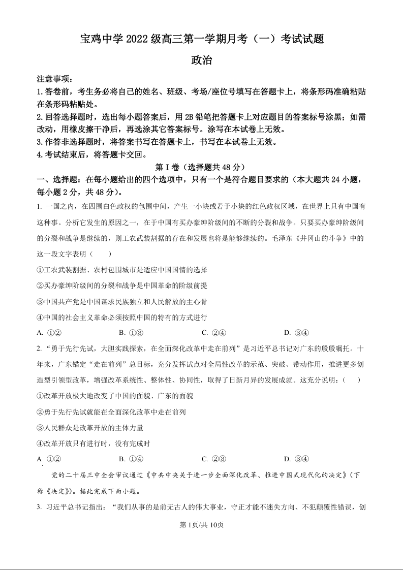 陕西省宝鸡中学2022级高三第一学期月考(一)政治试题(原卷版)