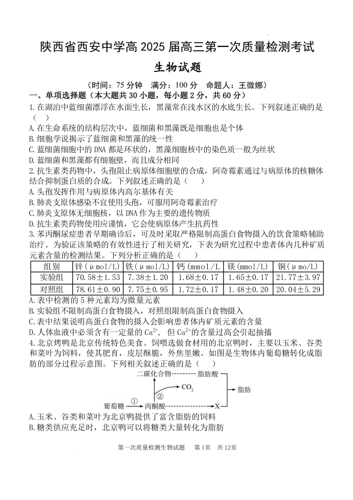 陕西省西安中学高2025届高三第一次质量检测考试生物