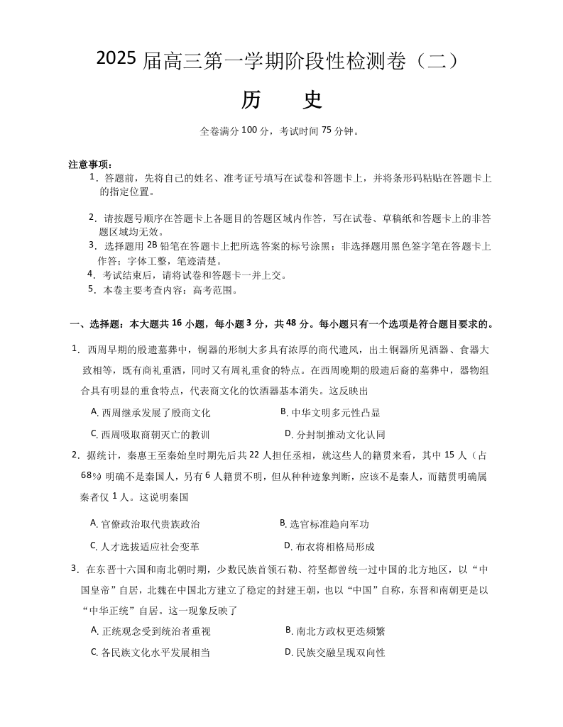 2025届陕西省教育联盟高三上学期第二次阶段性检测历史