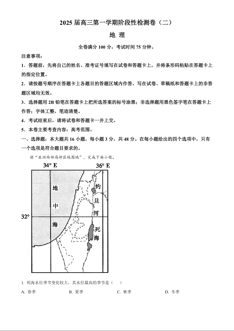 2025届陕西省教育联盟高三上学期第二次阶段性检测地理+答案