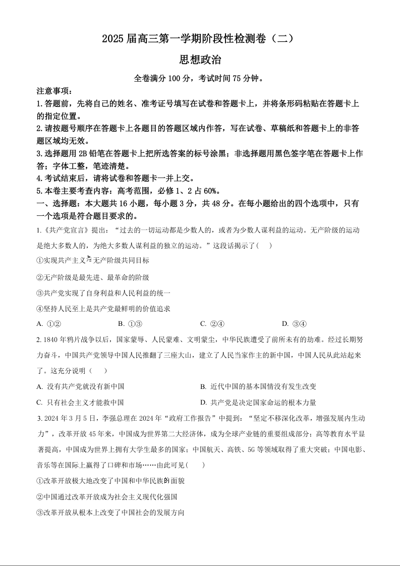 2025届陕西省教育联盟高三上学期第二次阶段性检测政治+答案