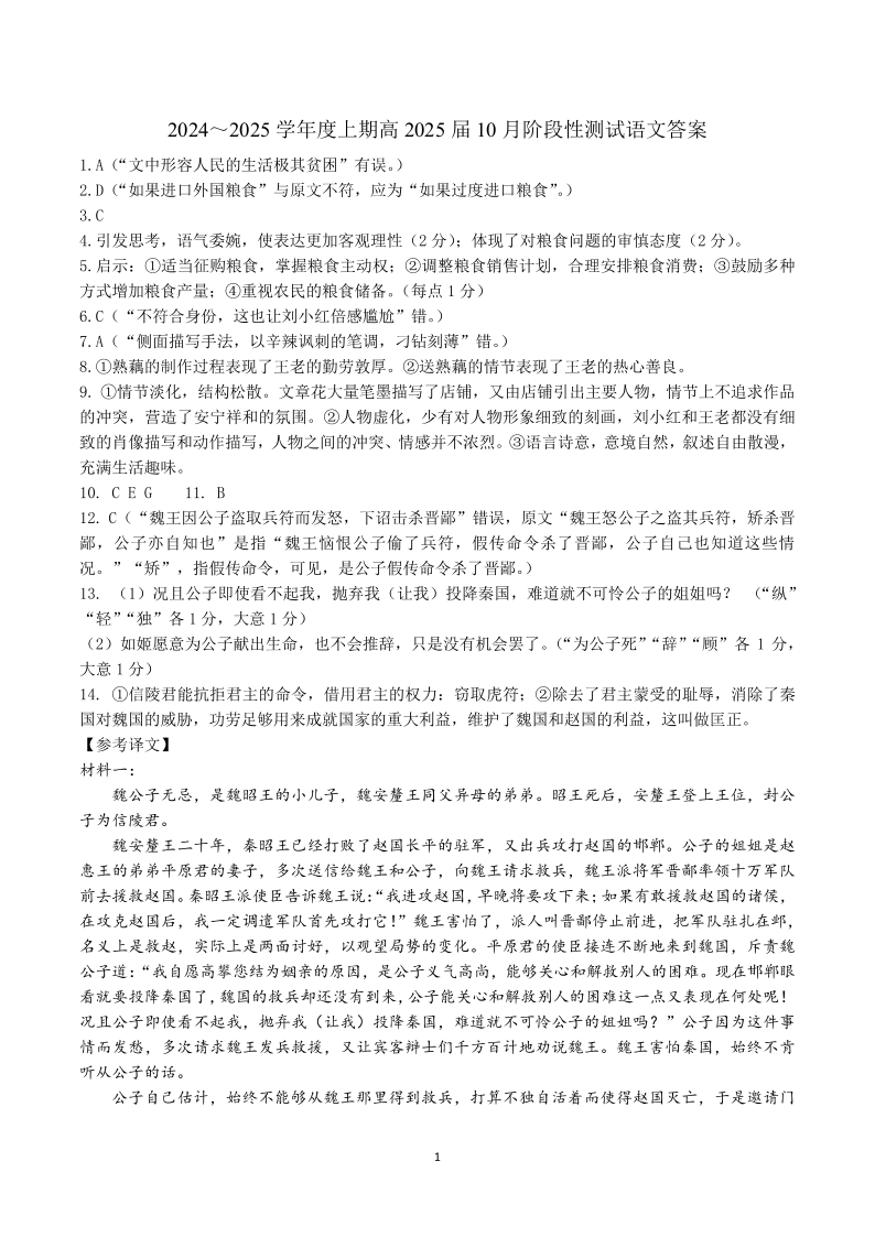 四川省成都市第七中学2024-2025学年高三上学期10月月考语文试题答案