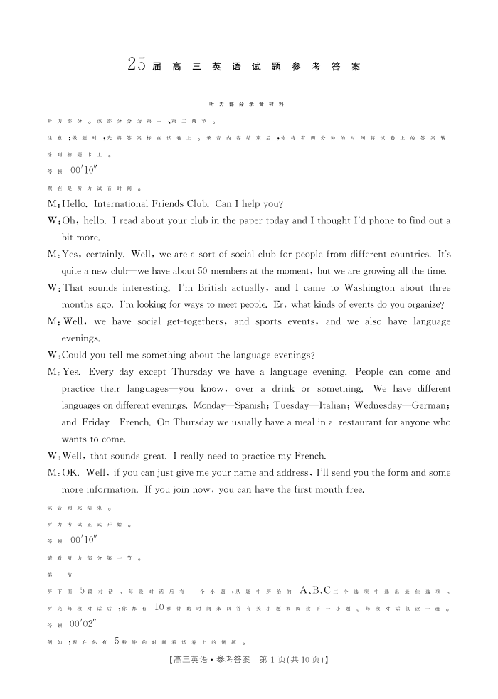 四川省2025届高三部分高中10月联考英语答案