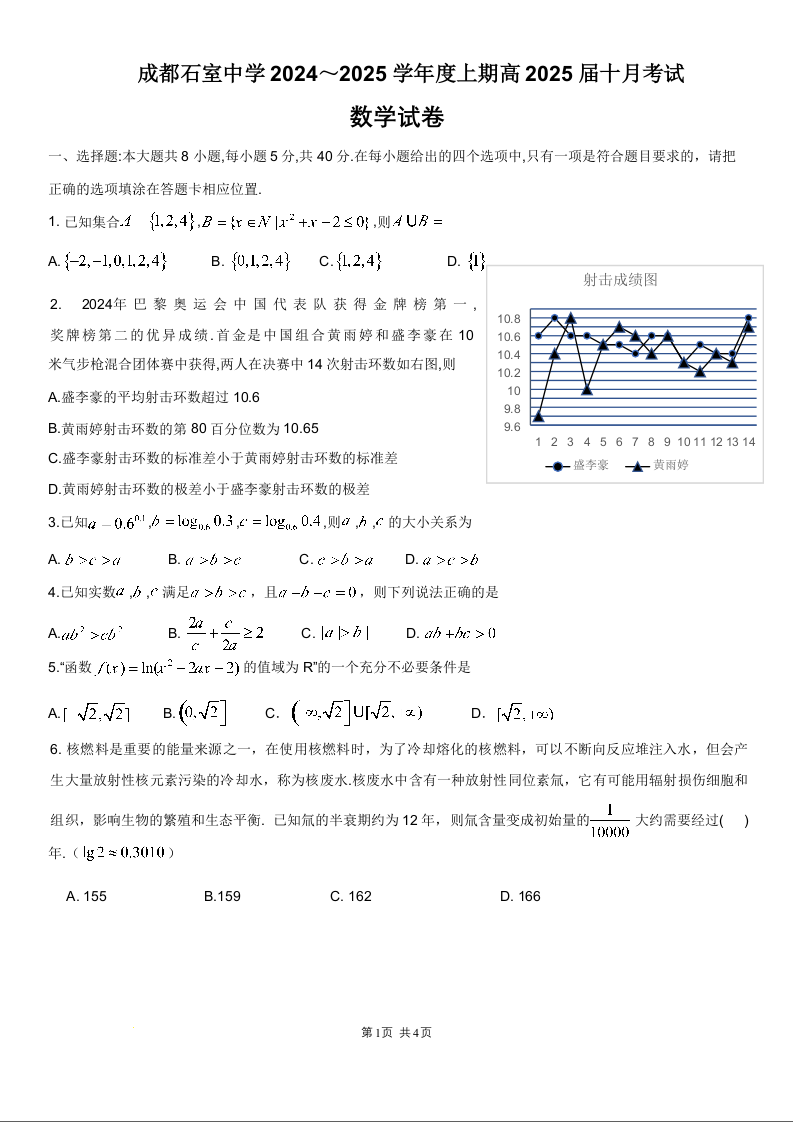四川省成都市石室中学2024-2025年学度上期高2025届10月考试数学