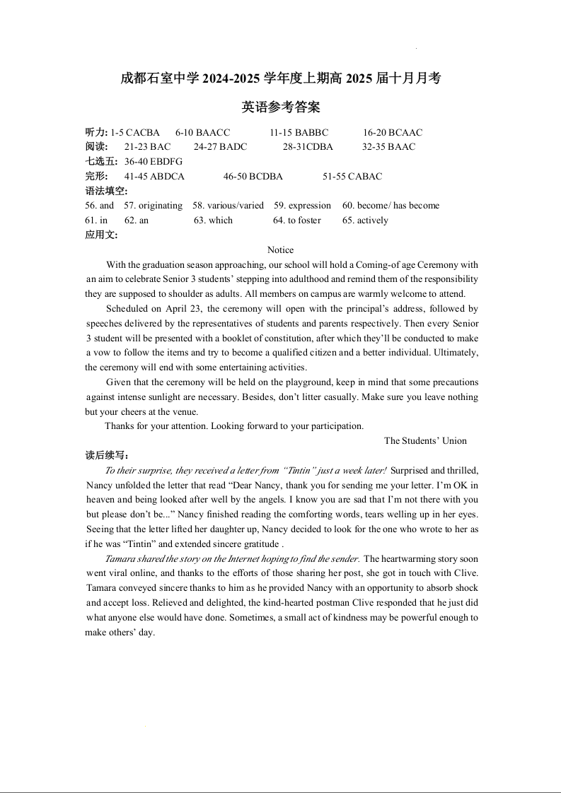 四川省成都市石室中学2024-2025年学度上期高2025届10月考试英语答案