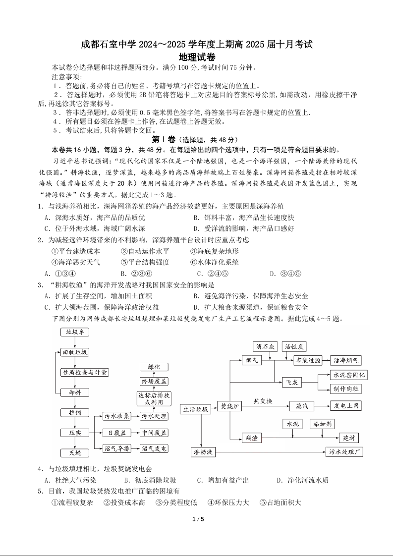 四川省成都市石室中学2024-2025年学度上期高2025届10月考试地理