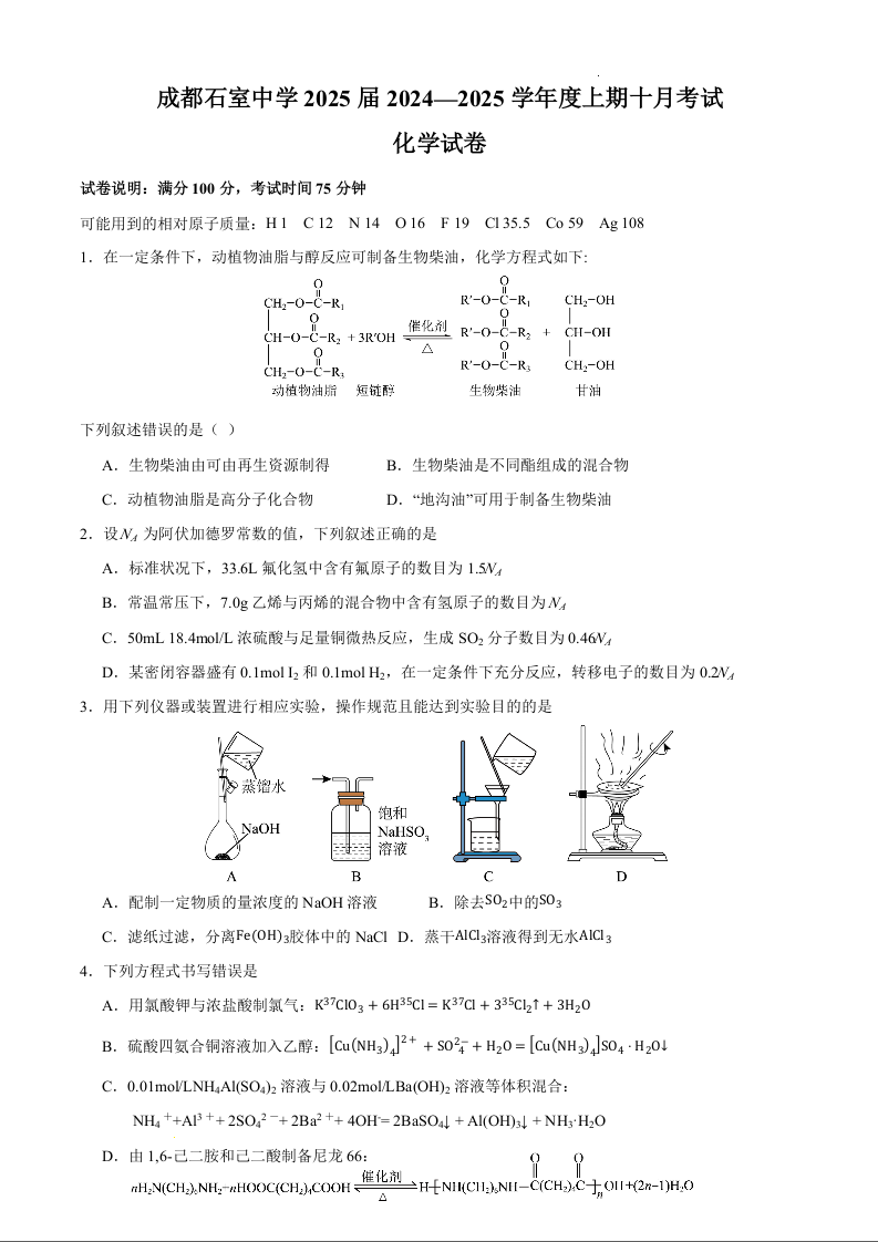 四川省成都市石室中学2024-2025年学度上期高2025届10月考试化学