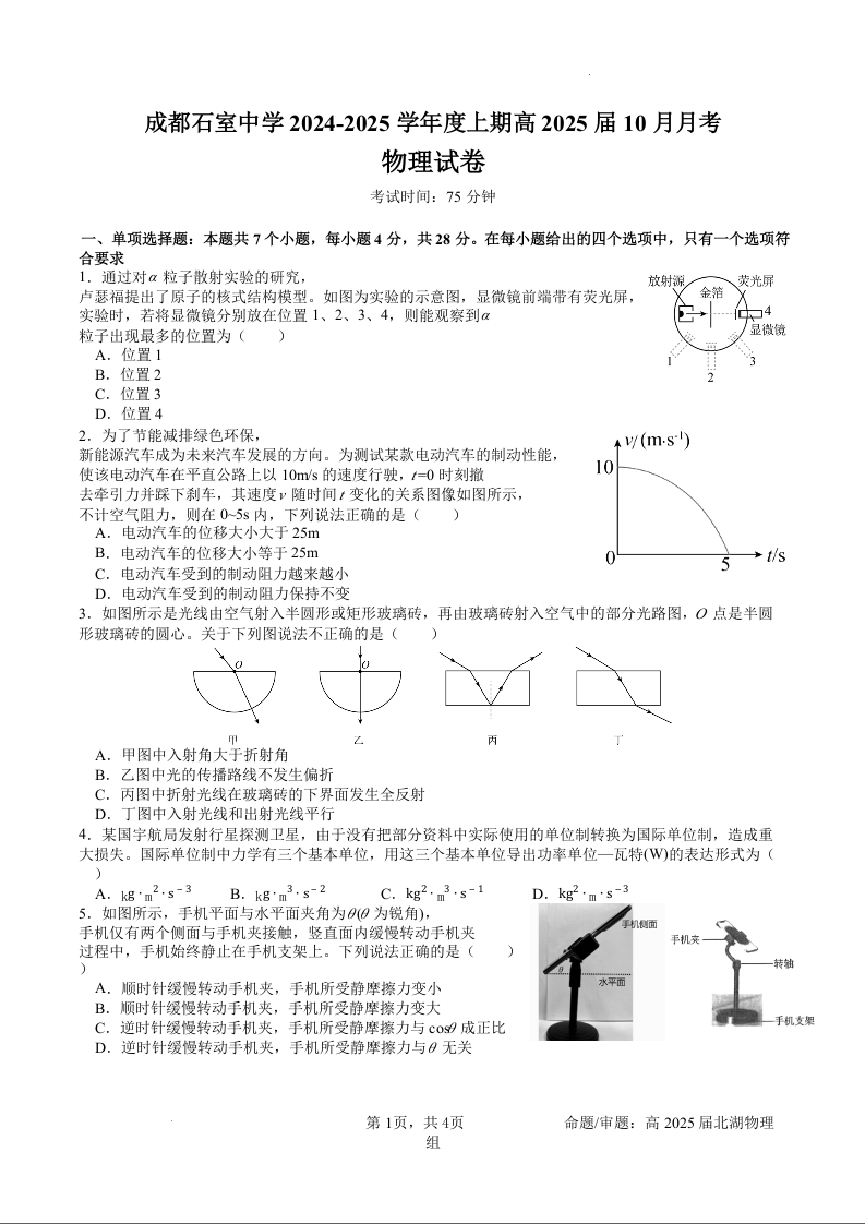 四川省成都市石室中学2024-2025年学度上期高2025届10月考试物理