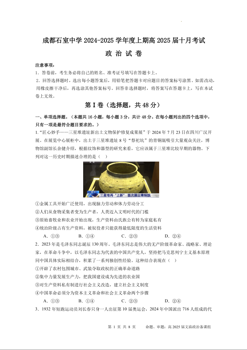 四川省成都市石室中学2024-2025年学度上期高2025届10月考试政治