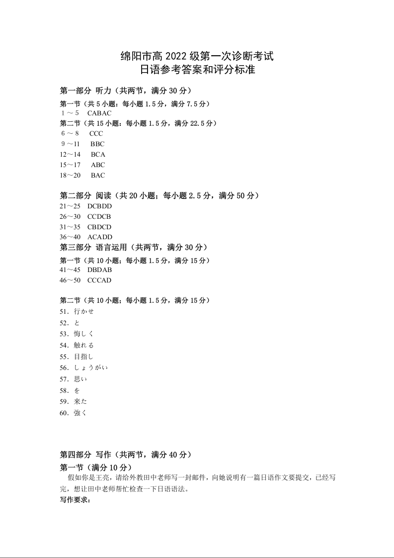 绵阳市高中2022级第一次诊断性考试日语答案