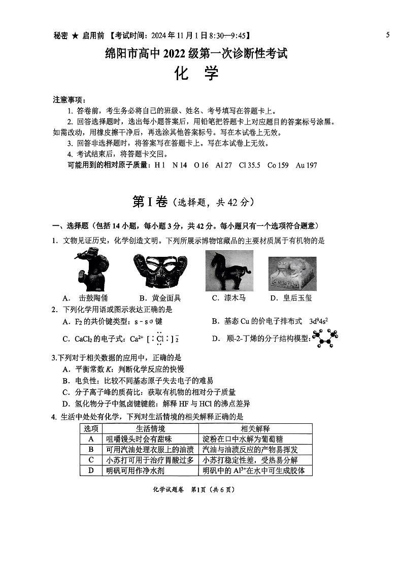 绵阳市高中2022级第一次诊断性考试化学