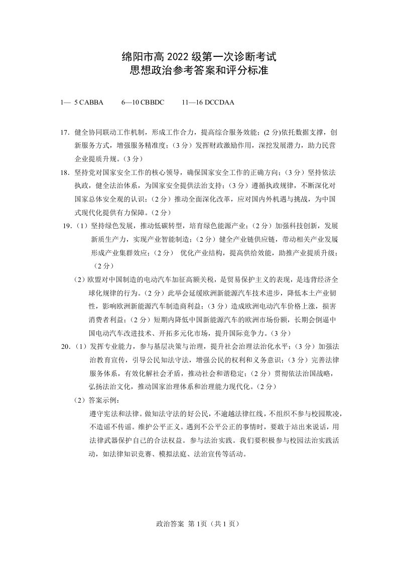 绵阳市高中2022级第一次诊断性考试政治答案