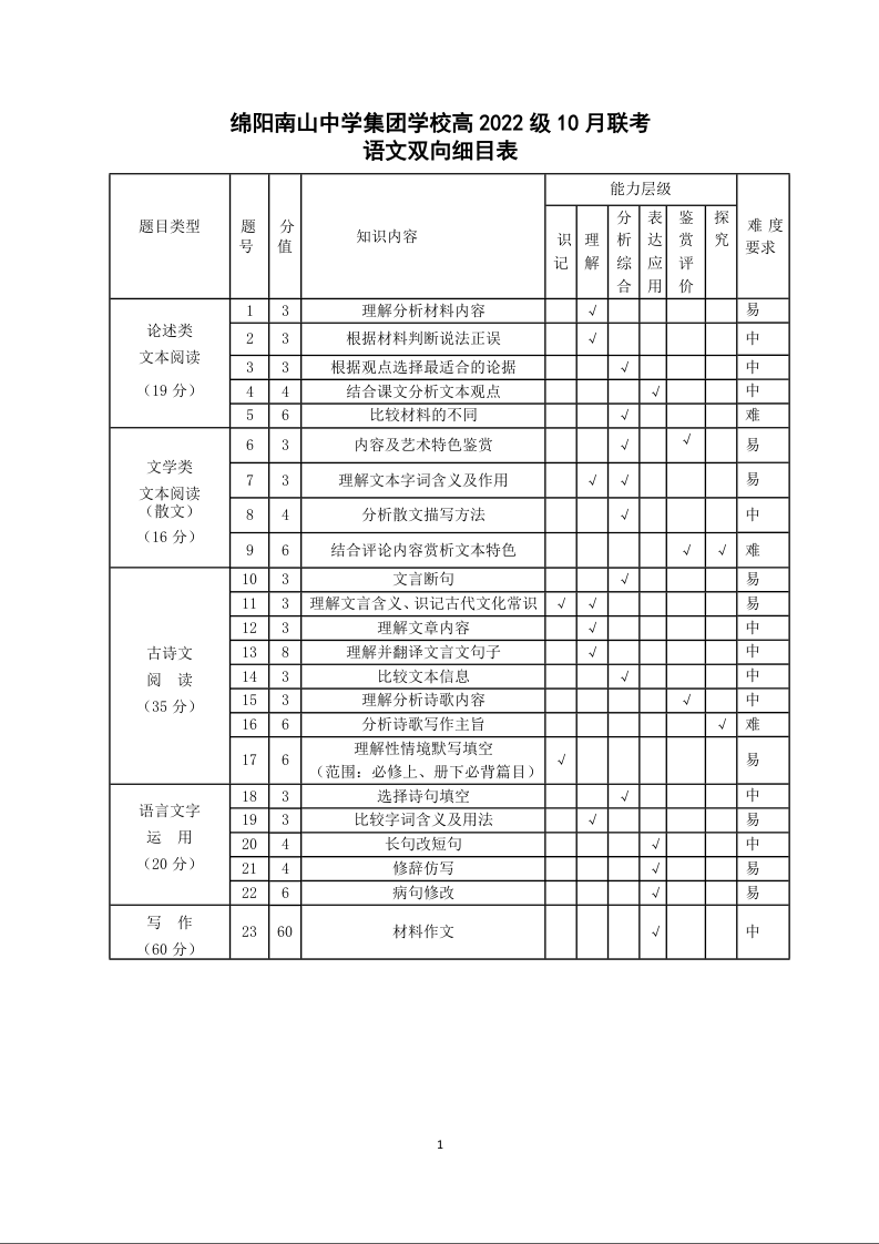 四川省绵阳市南山中学集团学校高2022级10月联考语文多维细目表