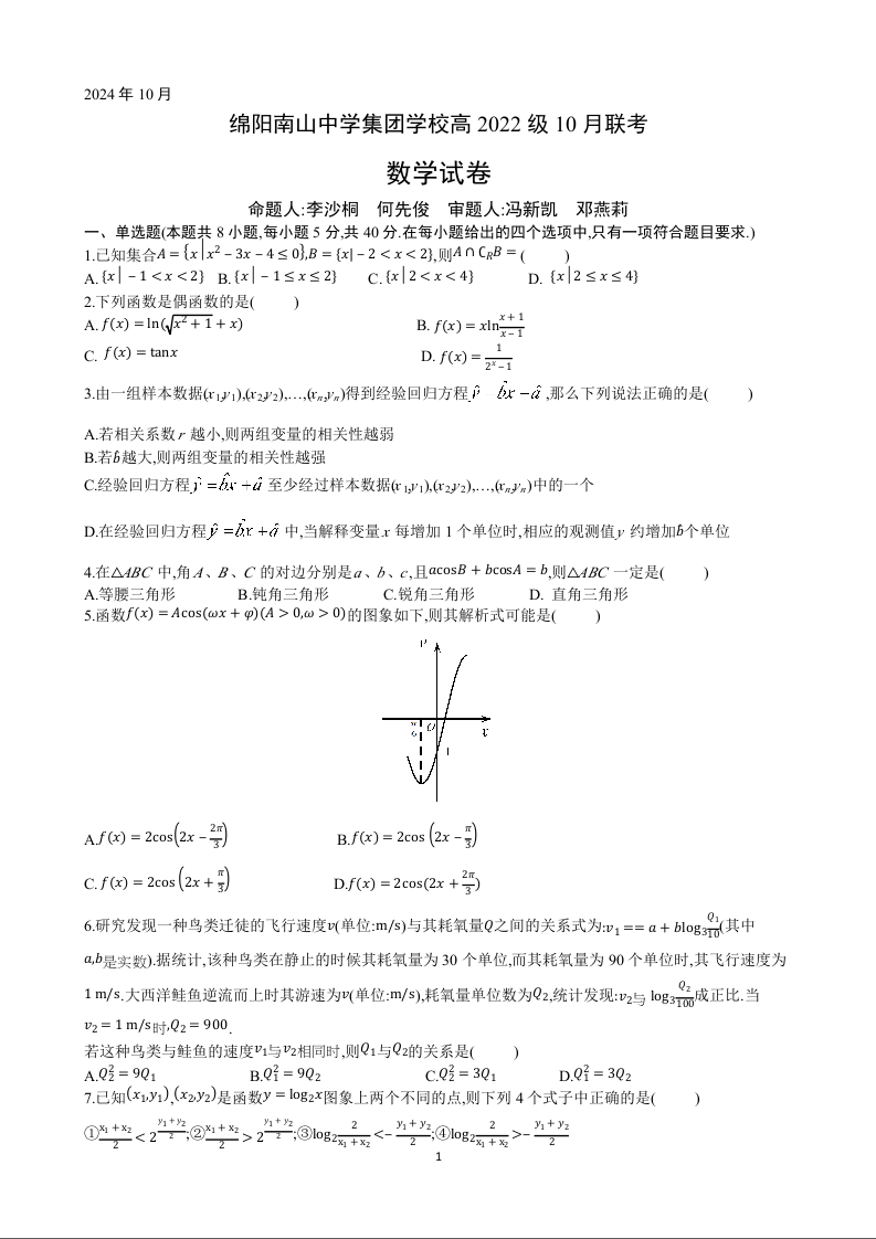 四川省绵阳市南山中学集团学校高2022级10月联考数学