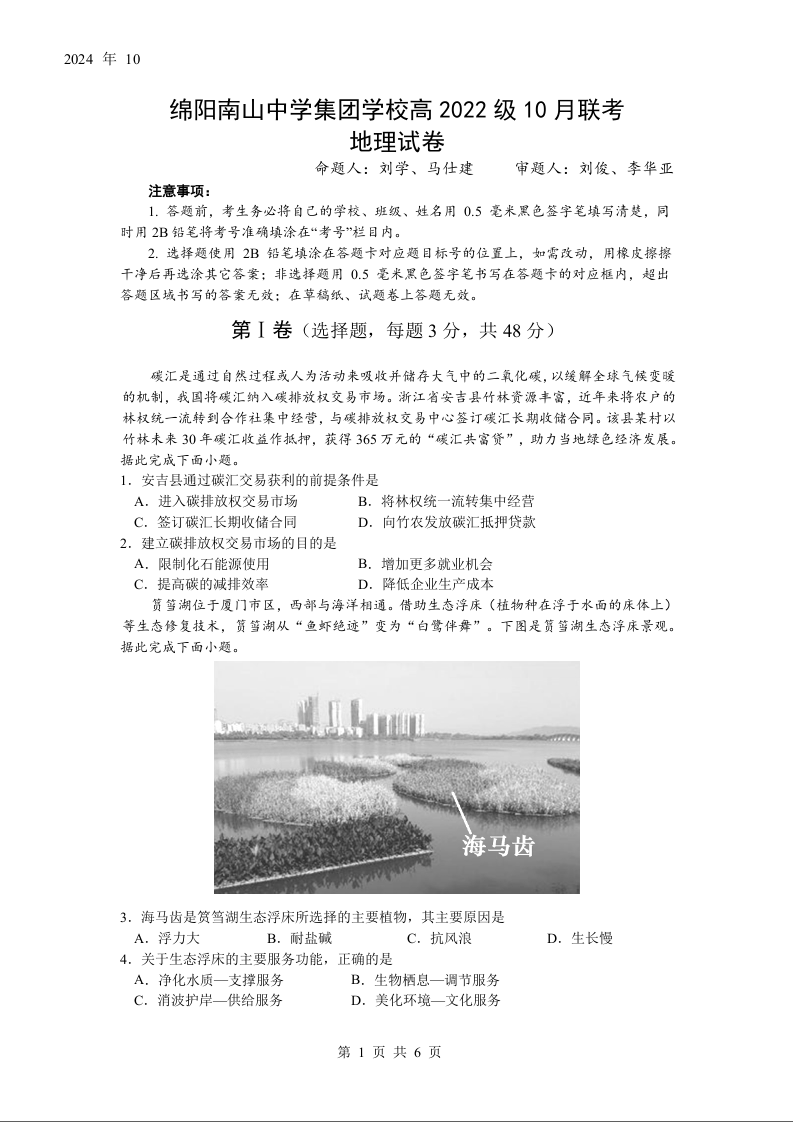 四川省绵阳市南山中学集团学校高2022级10月联考地理