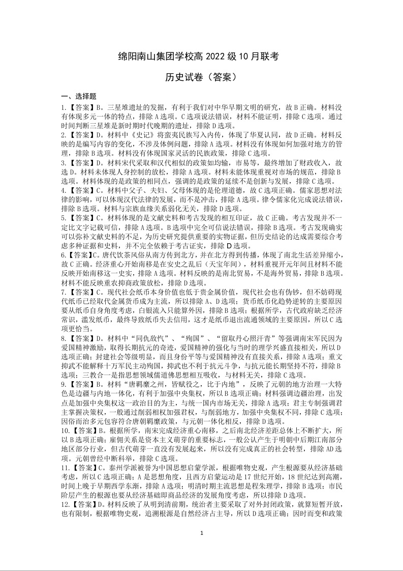 四川省绵阳市南山中学集团学校高2022级10月联考历史答案