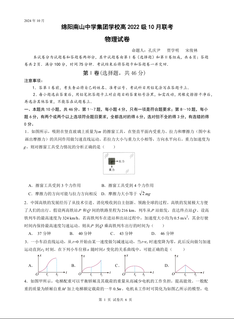 四川省绵阳市南山中学集团学校高2022级10月联考物理
