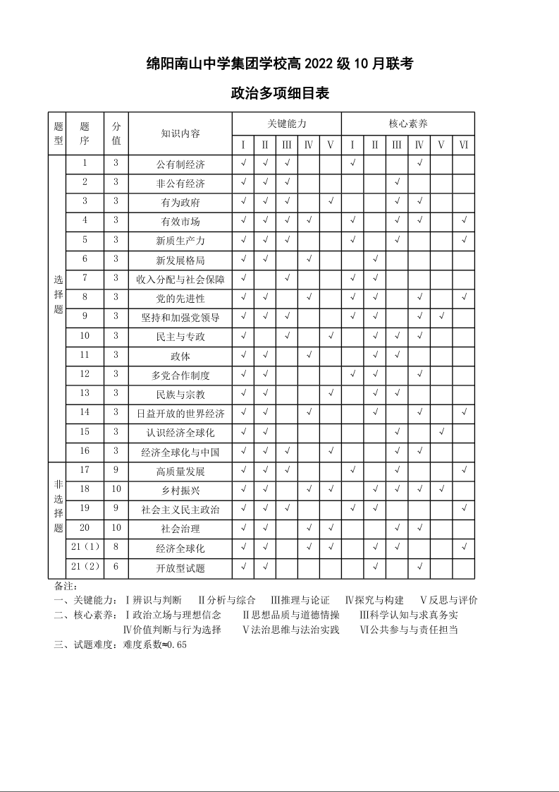 四川省绵阳市南山中学集团学校高2022级10月联考政治多维细目表
