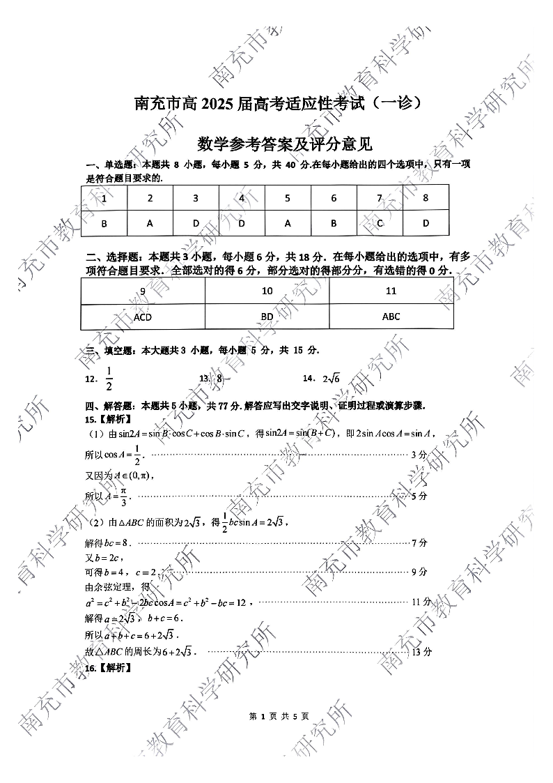 四川省南充市2025届高三高考适应性考试(一诊)数学试题答案